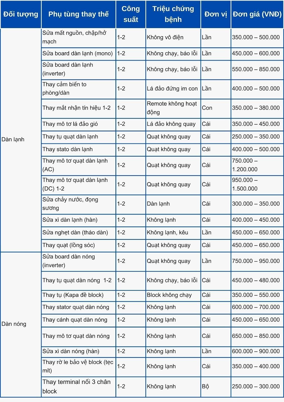 Bảng giá dịch vụ sửa máy lạnh Phường Bình Trị Đông tại Điện Lạnh MT được niêm yết theo từng hạng mục cụ thể để khách hàng thuận tiện ước tính chi phí trước khi quyết định. Mức giá thực tế sẽ phụ thuộc vào công suất máy, vị trí lắp đặt và tình trạng hư hỏng sau khi kỹ thuật kiểm tra tận nơi.